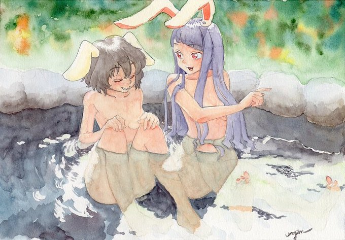 #毎月17日と18日はイナバの日 ということでうどんげとてゐを描いてみました(*'▽') 「温泉うさぎ」 #鈴仙・優曇華院・イナバ #因幡てゐ #透明水彩 #Watercolor #水彩画 今回は肌色率100%ですm(__)m
