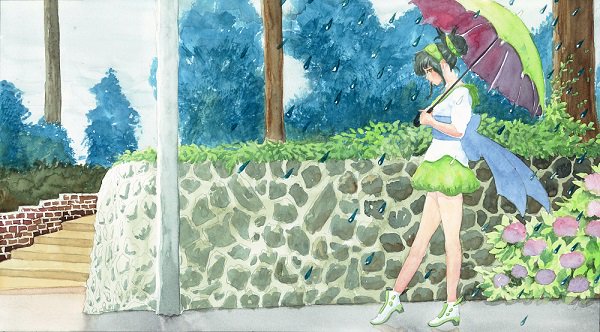タイトル:東北ずん子梅雨空紫陽花UFO 今日の落書きシリーズに加筆しました。(#^^#) #東北ずん子 #透明水彩 #今日の落書きシリーズ #加筆