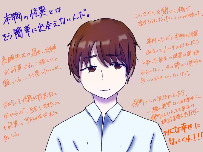 自分の過去を話し、深町くんに手を差し伸べる高槻先生。過去の話をしているときはすごく苦しそうで、でも口元は笑ってて。深町くんに語りかけるときは、やっぱり先生だなぁと思わせる強さを感じた。深町くんも高槻先生も互いに救われてたんだなぁ…。#准教授・高槻彰良の推察 #伊野尾慧