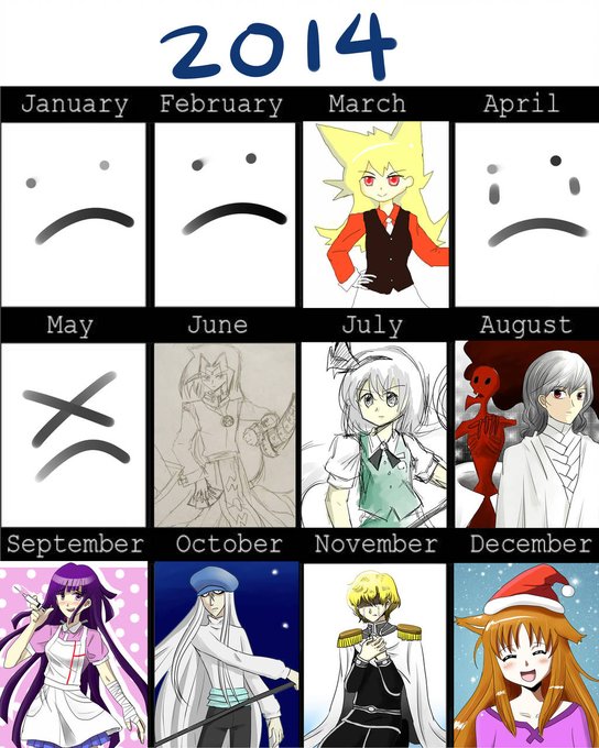I made an art summary for this year! And I put my 2014 one next to it too since it's the only other time I made one of these things (Drew too little in 2015-2017 to make meaningful summaries 🙃)
