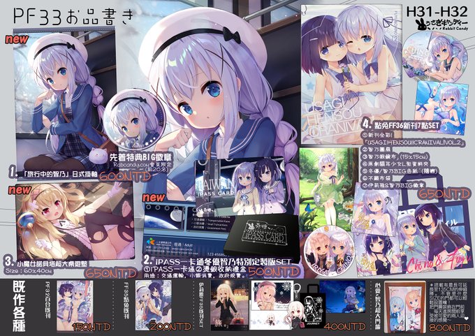 台湾PF33のお品書きです!新作はごちうさとノベタちゃんのグッズ、それとFF36で頒布してた旧作です。当日よろしくです!