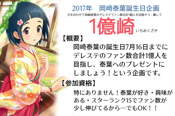 デレステにて、岡崎泰葉のファン数1億人を目指す企画をやっています! ☆詳しい企画内容→https://t.co/xPkmbYENyj ☆参加方法は2つあります♪ 1つ目の参加〆切は【4/16】まで!2つ目はなんと【スクショを撮るだけ】です!! #1億崎