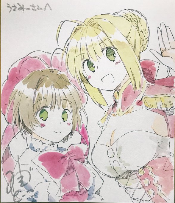 水月とーこさん( @mizukitoko )に描いて頂いた「CCさくら」のさくらちゃんと、Fate/EXTRA (FGO) のネロです。声繋がり。かわいい。かわいい。