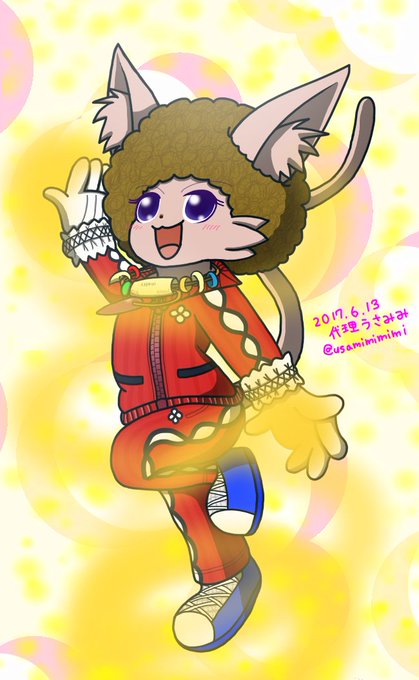 できたーアフロと代理うさみみ 代うさの言霊拳で球を出してます ただ黄色く光ってるだけなので無害ですが、代うさ次第で攻撃にもなり変わったりするよ。 #ジャージケモ