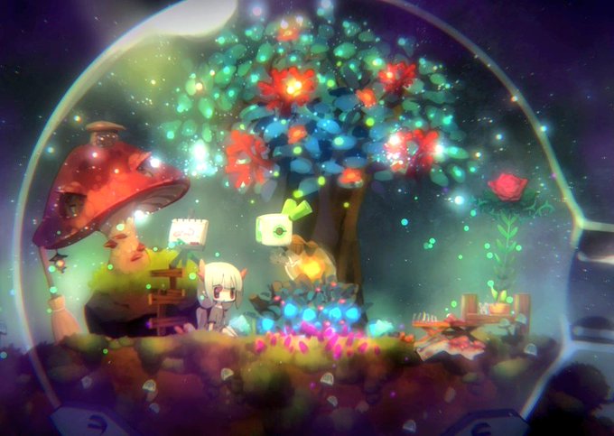 トリコちゃんの植物育成日記2 XX年後 以前に咲いた花は大きな木になりキノコの家の目印になりました。 トリコちゃんは最近、謎の植物2世の育成に成功した模様。相変わらず何を与えたかはわからない。 #ボイド・テラリウム