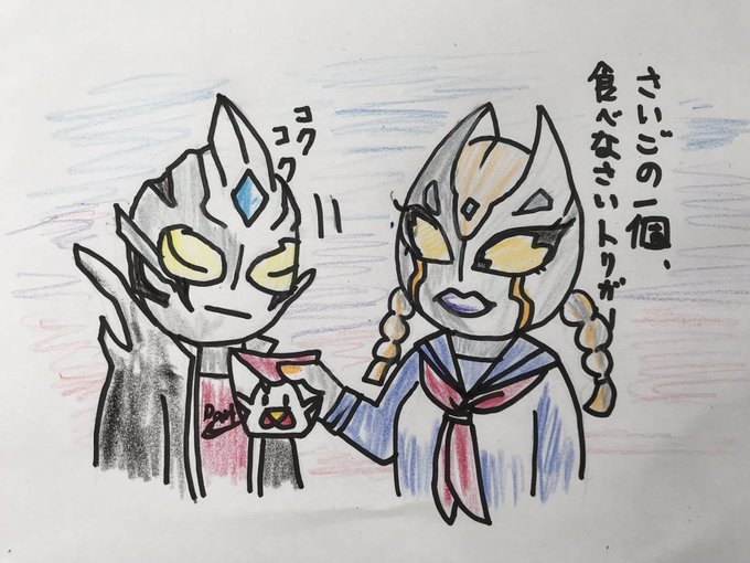 着衣卜ラマン注意。 放課後にコンビニ寄って、みんなで分けた残り1個のからあげクンを卜リガーにあげる力ルミラさん。 ガワ描くの難し過ぎる……。
