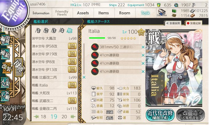 良いタイミングでポイントもらえたので、一気に700pt貯まって海外戦艦のレベルを100にした... 今年のハロウィンはこれにて終了... #DMMGAMES #艦これ