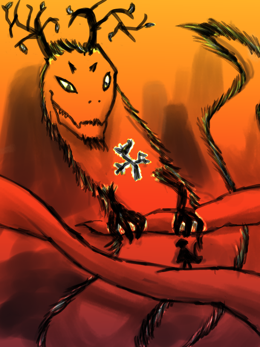 「夕焼けに染まる木龍」 龍を描きました、初めての幻獣です。描いてて楽しかったです! #lackhw