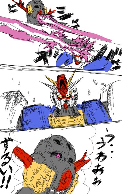 @usukawa5 ジオングは手強く、ついに頭部パーツであるメイン・カメラを破壊されるガンダム。しかし、ガンダムのパイロット、アムロ・レイは全く意に介せず、シャアを追い立てるのであった…