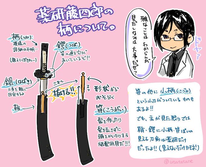 薬研藤四郎をまじまじと観察したり調べていたら、おしゃれニキやべぇ!!となったのでちょっと図解しました。見た感じ笄や小柄がついてそうなのは薬研ニキだけでしたよ。間違ってる箇所あったらすみませぬ。 #刀剣乱舞