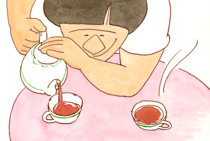 【気にしない気にしない〜 デイリースケッチ085】 「ぼく、この紅茶大好きなんですよ〜!」 カップがちょっとくらい割れてても気にしない気にしない〜 #uwabami #ボンとハレトモ
