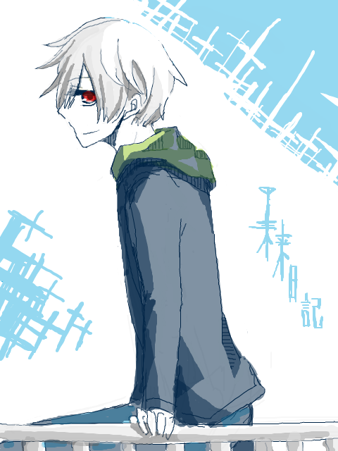 ・見た目。白髪赤目・前髪から覗く目とパーカーみたいな服