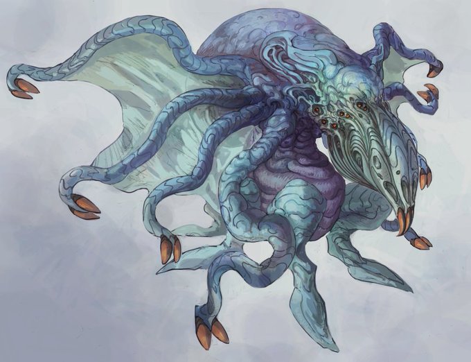 前描いたクトゥルフな怪獣のラフを仕上げてみた。結構異次元感のある色味になったかな? #クトゥルフ神話 #クトゥルフ