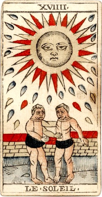 随想。映画『君の名は。』を世界札に擬えることも可能だろう。伝統的に両性具有とも言われる中央の人物は男女の入れ替わりや男女の魂の一体性を。「上の如く下も然り」で左手の指す上は新プラトン主義的に夢の世界、右手の指す下は現実の世界。呼び交す夢。身に纏う布ないし周囲の環は例の「組紐」。