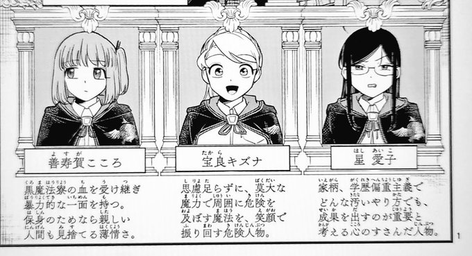 オススメの漫画です! 表紙で変なもの持ってますが、魔法学園ものです! 主役3人のプロフィールも載せておきます! 今月8日に1巻が発売ほやほやです!ぜひ!