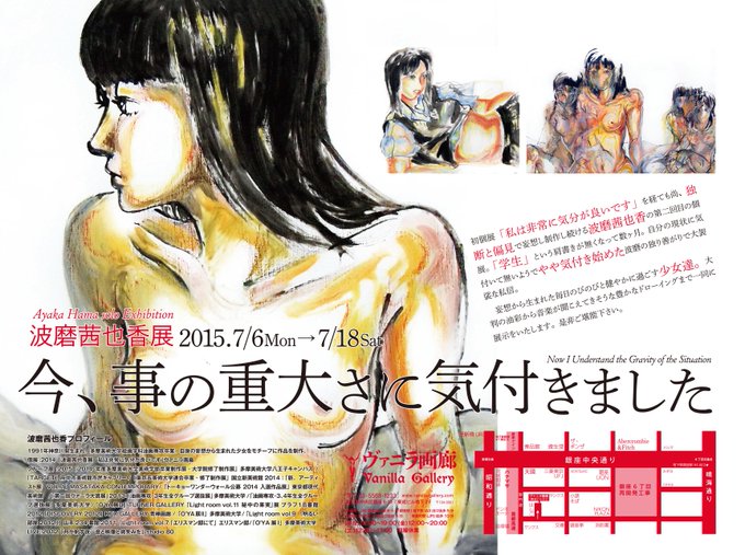 本日最終*17時まで【波磨茜也香展「今、事の重大さに気付きました」】学生を卒業し、社会に出た波磨の創造と妄想の日々。キャンバスの中でくつろぐ鮮やかな少女たちの姿をご高覧ください。http://t.co/paPDZp9P76