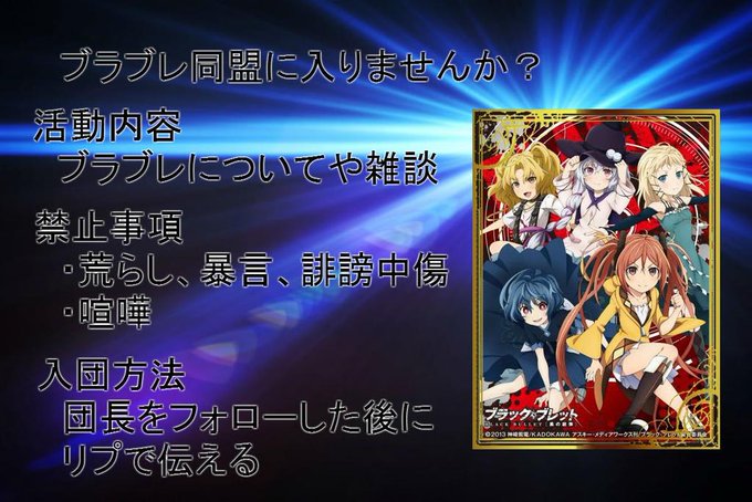 突然すみません🙇ブラックブレット同盟縮めてブラブレ同盟に入りませんか?現在メンバー45人です。ブラブレが好きな人いまから見る人大歓迎メンバー一同皆様をお待ちしています。入ってくれる際はフォローのちリプでお伝えください。(僕のいまのアイコンにはふれないで)
