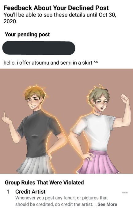 HELP MY SEMI AND ATSUMU ART GOT DECLINED ON AN FB GROUP BECAUSE I DIDNT CREDIT THE ARTIST 😭😭😭😭😭 BITCH I AM THE ARTIST HELP ME I CANT STOP LAUGHING PLS 😭😭😭😭😭