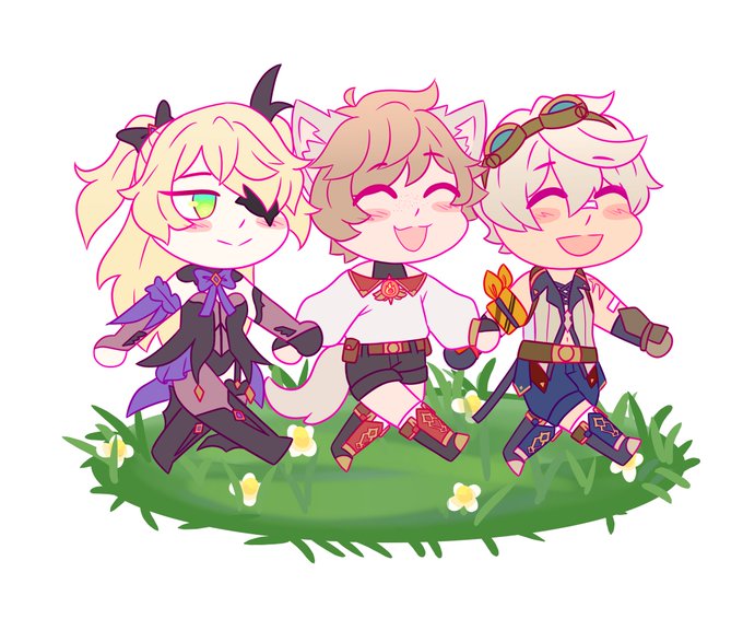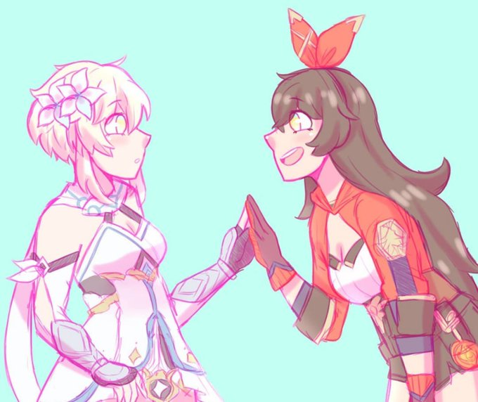 #LesbianCreators HIII HELLO i'm a nonbinary lesbian and i draw !!! i'm currently hyperfixated on genshin impact so i mainly draw fanart for it rn !!! the middle character in the third picture is my genshin oc :] i also occasionally do fanart for love live !!!
