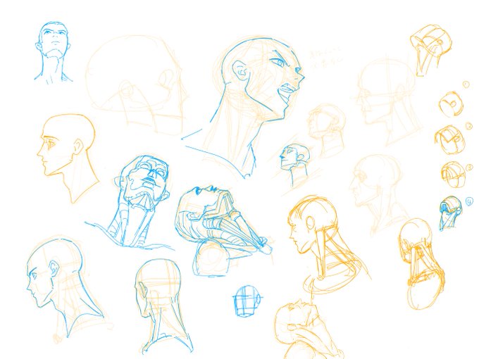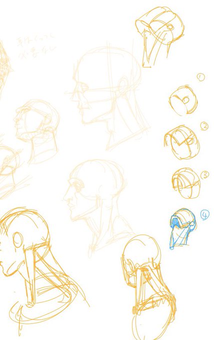 頭蓋部分(オーバル半切りにしたやつ)をかく→耳の辺りを終点にしてちょっと一段ずらしたかまぼこ型の下顎をつける→喉の部分だけかまぼこをあける でシルエット自体は書き出しできるようになりそう…だけど…問題は顔の中身の書き方ですね…