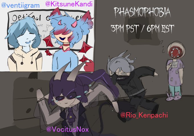 4 hours!! Phasmophobia!!!! All these lovely people!! BE THERE!!! (kandi will be a lil late!) IT'LL BE FUN AND I'LL TOTALLY NOT SIT IN THE VAN THE ENTIRE TIME!!! (links down below!) NOT SITTING IN THE VAN LIKE A COWARD NOPE!! 😖🪦💙