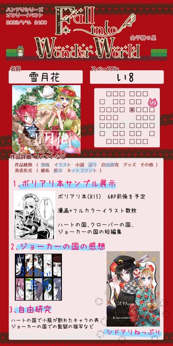 ボリアリ本のサンプルとジョーカーの国の感想展示予定です(ホワイトさん×アリス×ブラックさんサンドの落書きもおまけで)