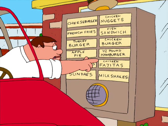I'll have six-thousand number nines, a number nine large, a number six with extra dip, a number seven, two number forty-fives, one with cheese-