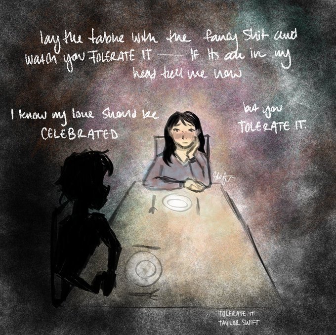 gonna do this kind of stuff for Evermore - first image my head comes up with for songs that particularly stand out to me. some examples, from The Dark - SYML and Exile - Taylor Swift