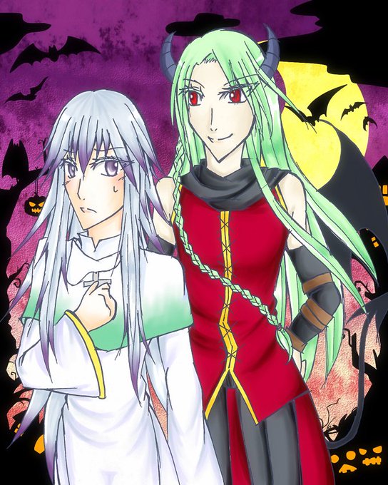 ハロウィン絵もう一枚!こっちはソルマとラザリマです。 ソルマ→神父 ラザリマ→悪魔、の仮装で。 ハロウィンが何だかよく分かってないけど超ノリノリで楽しんでるラザリマと何で俺がこんな事しなきゃいけないんだ?なソルマの図。