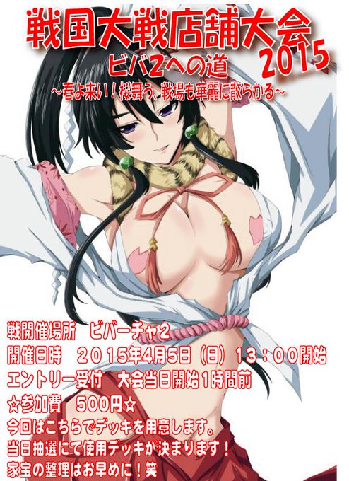 4月5日(日)に戦国大戦の大会を開催しますよ~♪ 今回はこちらでデッキを用意いたしますので、華麗に散らかってくださいね♪
