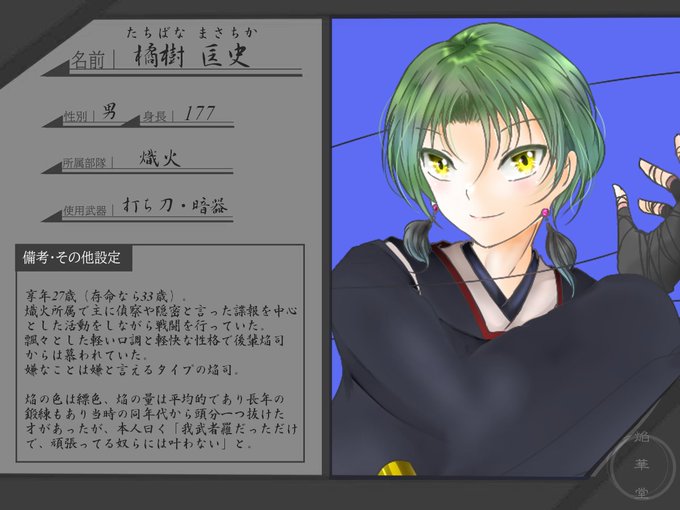 此方の企画様【@engadou】に9人目、故人2人目で参加させて頂きます。 既に殉職しているので、過去回想や生存ifのみでしか動けませんが、良ければ遊んでやってください。 #焔華堂_CS