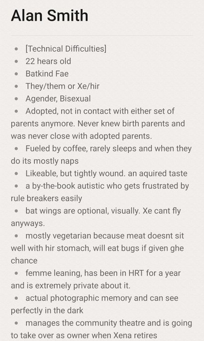 [TechDiff] Alan Smith, a batkind fae community theatre director. Uptight, kind of a bitch, dry sense of humor and perpetually tired. Easily flustered and very easily riled up.