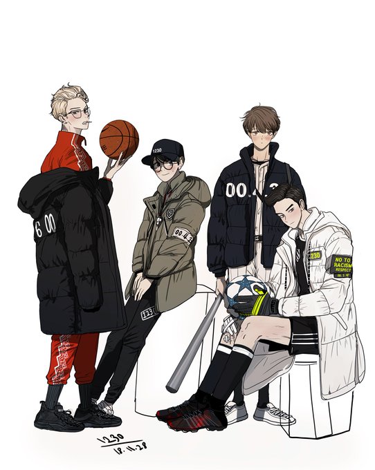 생일 와니(@0617_0423_0115)님 리퀘로 강세 남수 금수 쓰리샷을 그렸었는데 오랜만에 가족사진(?)이니.. 형오빠지면 섭섭할거 같아서 함께 그려봤어요 :) 강세는 길거리농구 금수는 축구(골키퍼) 남수는 야구 형오는 운동 코치 느낌으로 그려봤습니다 :) 18 Winter Collection(?) 1230 BY