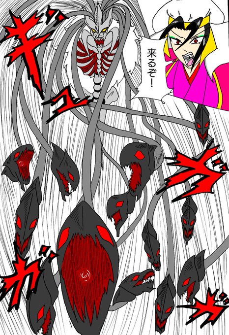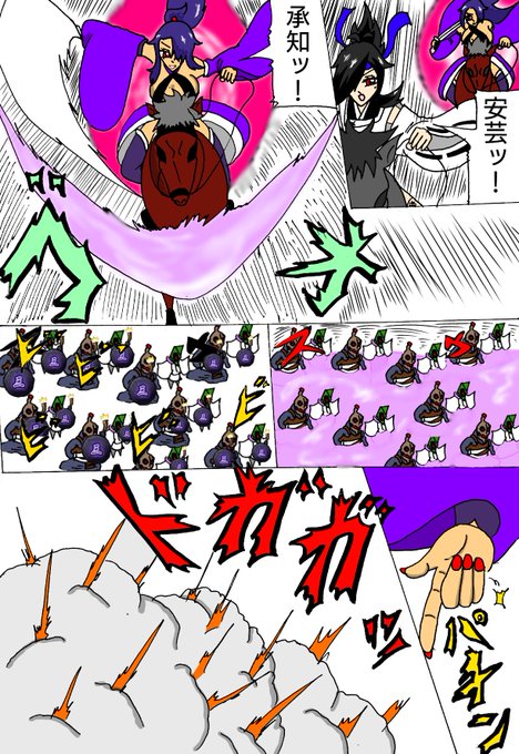@uto_haba 雨都さんの漫画だと、禍憑が刀を振った斬撃の背景が透けておりますが、私は透かさず線だけで表現しています。こうすることで斬撃の後ろ側を書く必要が無く、作画コストが削減できます。 あとは擬音を大きく書く(三枚目)と作画コストの削減と同時に迫力も出るのでおすすめです。