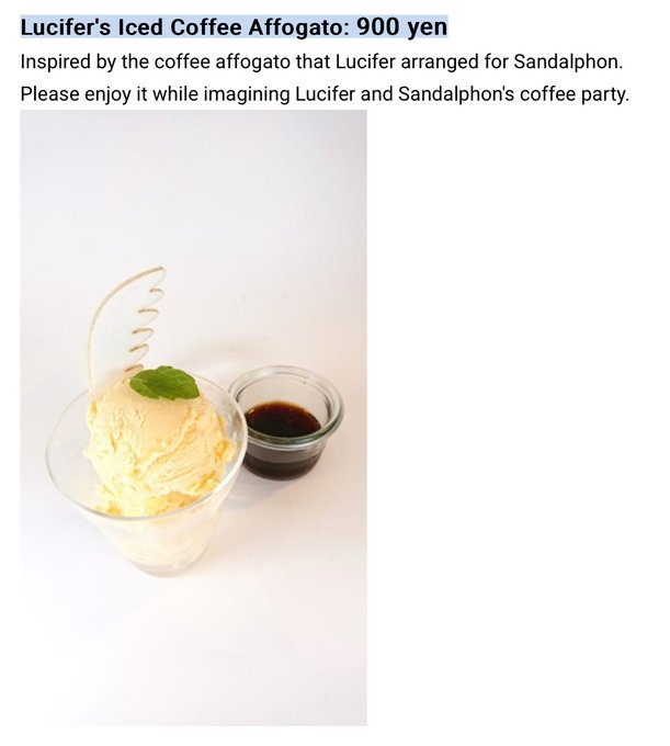 (Courtesy of friend Zen) Sandalphon’s first featured barista art was from the Jul-Sept 2018 (before 000) Tower Records Cafe collaboration. One dessert menu itemcontains an affogato, which is inspired by a coffee affogato Lucifer prepared for Sandalphon. https://t.co/f2svp9dYb1
