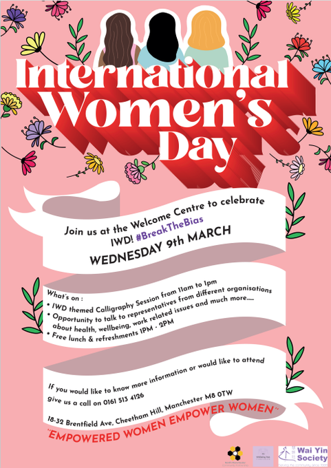 Join us on Wednesday 09/03/22 at the Welcome Centre where we are creating IWD inspired calligraphy from 11am, talking about health & wellbeing & enjoying a fantastic lunch together. Call 0161 513 4126 to join #InternationalWomensDay #IWD2022 #community