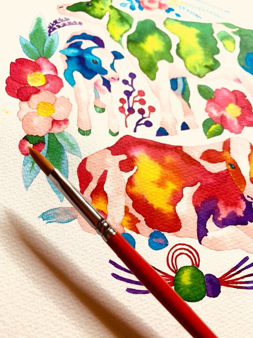 こんな時間まで起きてたの久しぶりだ…お年賀描いてた。年明けてるけど、出す〜🐄うおお