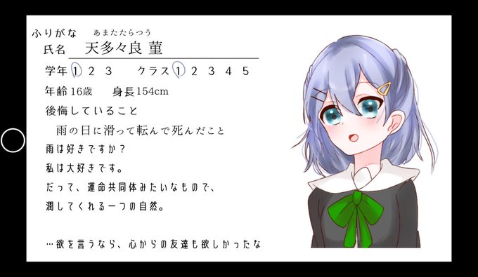 天多々良菫と申します。雨女だった少女です、控えめですが仲良くしてくださると幸いです……!