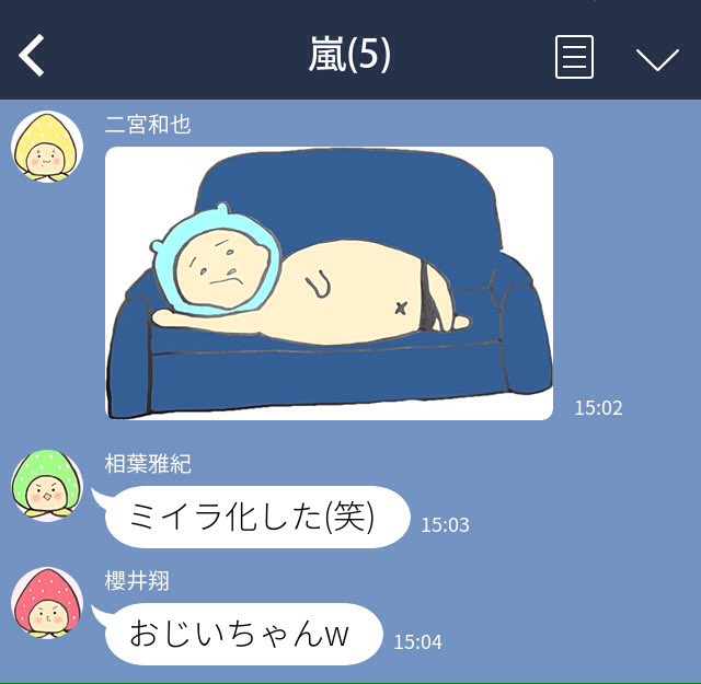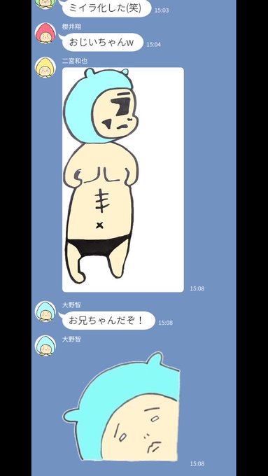 翔潤がマッサージ受けてた時ニノから嵐のグループメールにパンイチの座ってくたばる智の写真が。それに対して翔雅が返信するとムキムキ智と共に智から「お兄ちゃんだぞ」とレス。