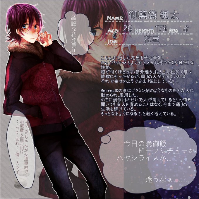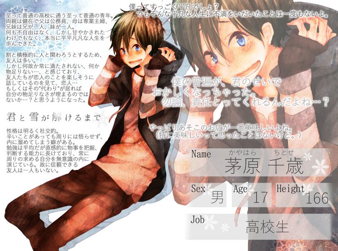 といさん(@min101_g)にはこやつを…!ほんとのほんとに別名義企画垢でだしてた子。なんというか 目が死んでてひょろい人を、見てみたいなって思って そしてもやくん可愛いです 最高に描いてもらいたくて迷ったのが二枚目(御薬袋)