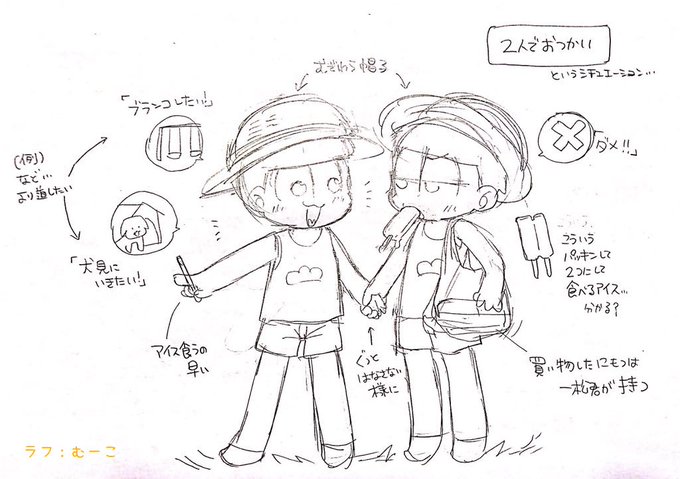ちゅりさんとむーこさんと一トド交換会したよ💜💖欲しい派生やシチュエーションをラフにして後の二人に描いて塗って貰いました!これはむーこさんラフ・ちゅりさん線画・塗りわらの「幼少の一トドがふたりでおつかい」です!楽しかった~😚✌✌✌