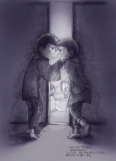 「大晦日」みんなが見てないところで今年最後のキス、みたいな… #一トド版深夜の真剣お絵描き60分一本勝負 @46_1dr テレビ見ながら2時間くらいです。今年一年ありがとうございました。来年もよろしくお願いします!