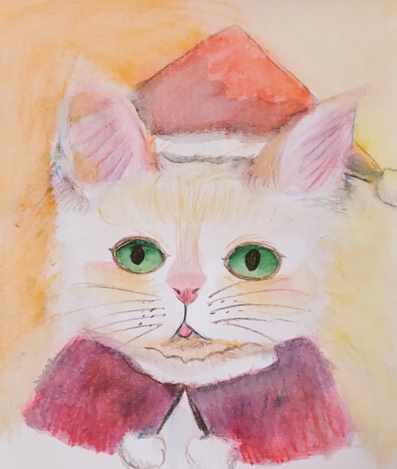 クリスマスにゃんこイラスト なんだか思い描いたのとは違う猫に(^_^;) メリクリにゃ(ΦωΦ)💕 #クリスマス #猫 #水彩色鉛筆 #色鉛筆