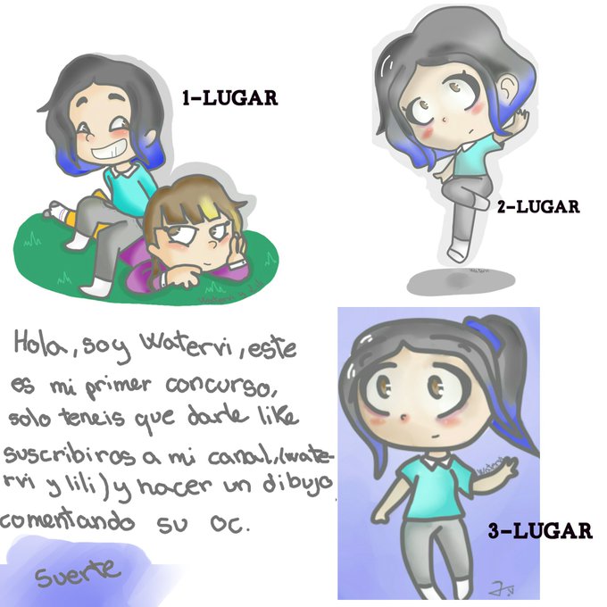 Suerte a todos😊👍el dibujo puede ser uno vuestro o si quereis uno mío,tendrán q etiquetarme y el canal se llama,Watervi y lili,SUERTE