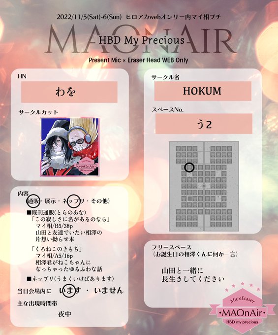 11/5-6 PLUTRA PLUS!! ~2022秋~ マイ相プチ #MAOnAir_3 【う2】でスペースいただいてます! 既刊2種の通販とうまくいけばネップリがあります(ネップリは今がんばってます) 本人は居たりいなかったりウロウロしてたりします! よろしくお願いします〜