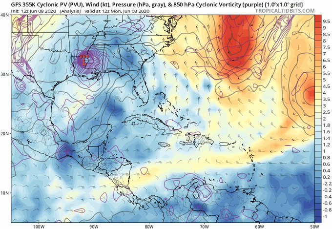 Despite lackluster model support, the large-scale environment seems conducive for tropical cyclogenesis here. Diabatic outflow from #Cristobal will help pinch off a PV streamer over the W Atlantic (in 🟡 & 🟠), creating a downstream upper level ridge that ventilates the Caribbean https://t.co/GrLdqpTiJk