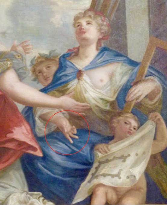 Masonic finger gestures found on #Meissen porcelain of the 18th century can also be found in the ceiling paintings at @Chiswick_House.This examples shows fingers opened to replicate compasses, communicated between Mercury & a personification of Architectute with set square below.