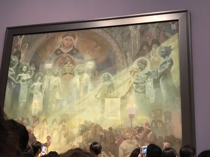 スラヴ叙事詩、国立新美術館に来た時に無理矢理にでも行って良かったな〜。今では考えられない人混みだったけど、人がどれだけ多くても絵を見るには仰がざるを得ない大きさと、光を捉えたミュシャの筆の力が凄かった