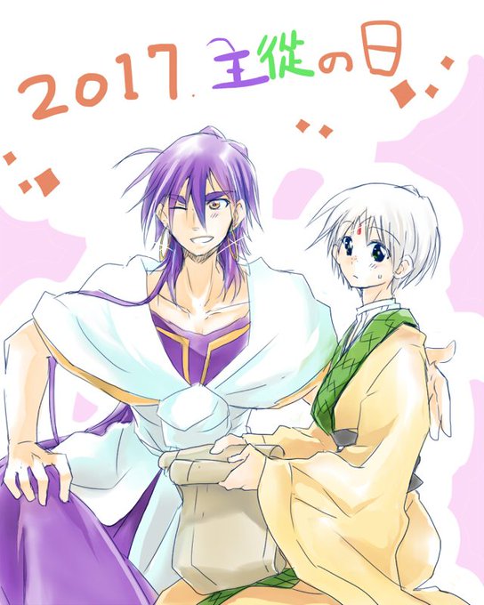 最初の目的を失ったホワイトデイ絵。結局ただのシンジャ絵になった_(UωU”_ 金属器付いてないシン様の胸板晒す感半端なし…