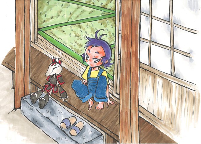 一枚目の縁側のイラストの原画と加工後になります。